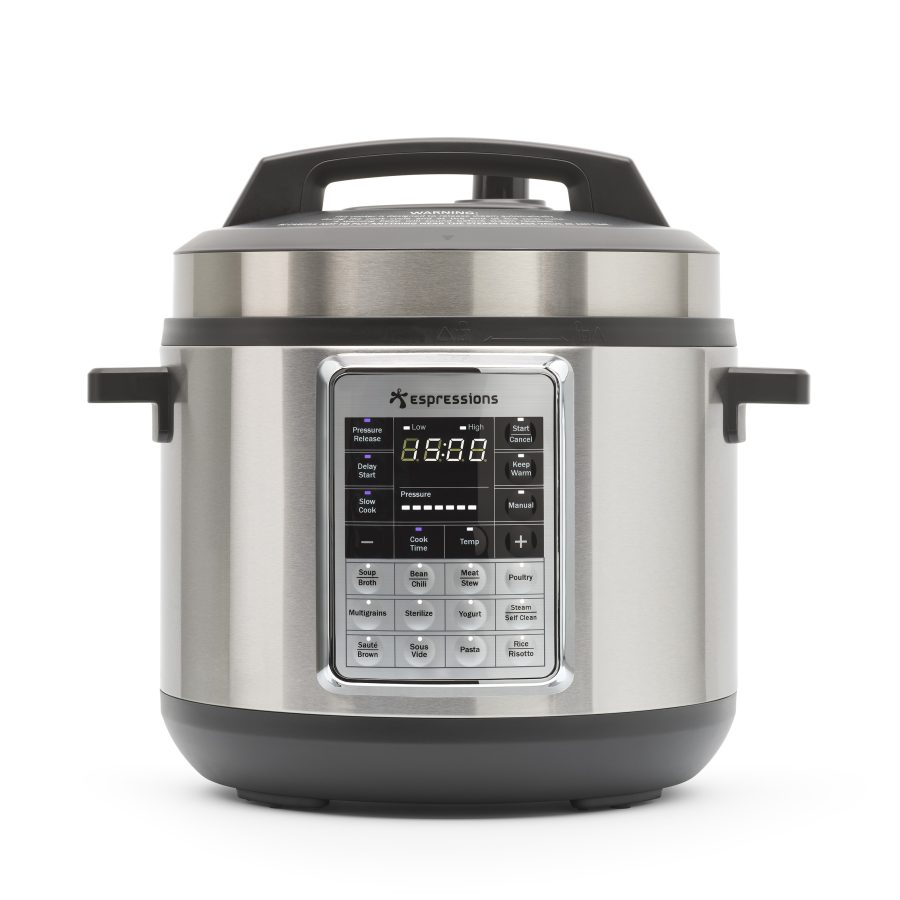 €179,00 incl btwDe Espressions Smart Pressure Cooker is een fantastisch veelzijdige machine. Met verschillende slimme voorgeprogrammeerde en zelf in te stellen programma’s bereid je razendsnel onder hoge druk een risotto, pasta, rijst, vlees, vis, gevogelte, groente, chili, soep en méér. Naast de hogedruk functionaliteit kan je ook slowcooken, sauteren, yoghurt makenkun je in deze pan ook gerechten sous vide bereiden. Het apparaat is compleet en beschikt onder andere over een hoogwaardige RVS binnenpan, een aparte glazen deksel, een RVS stoomschaal en stoomrekje.