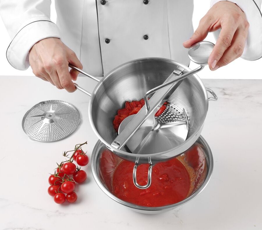 Zeer geschikt voor de bereiding van gebonden soep en tomatensaus. Inclusief 2 zeven (ø140 mm), grof en fijn.