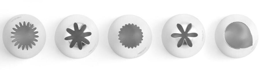 Set bestaat uit 5 spuitmondjes voor decoratie: – 2x closed Star – 1x drop Flower – 1x french Star – 1x v-shaped. Extra nauwkeurig dankzij scherpe randen.